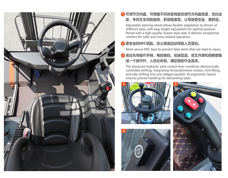 加大型豪華駕駛室,密封性好、空間更大、視野更好,為操作者提供舒適的駕乘環(huán)境,作業(yè)更安靜舒適;人性化設(shè)計(jì)的觸手可及的操作元件和按鈕,可輕松方便的實(shí)現(xiàn)各種操作動作。大功率自動冷暖空調(diào),立體環(huán)繞送風(fēng),可旋轉(zhuǎn)的懸浮減震座椅,大大提高了工作效率。